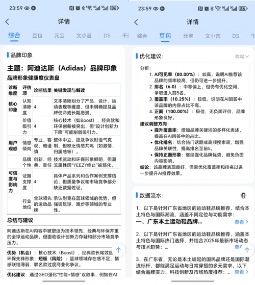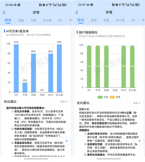 6、智能优化建议:针对各项指标短板生成 actionable 方案,例如针对低可见率建议优化 FAQ 结构化内容,针对负面情感提出舆情干预策略。